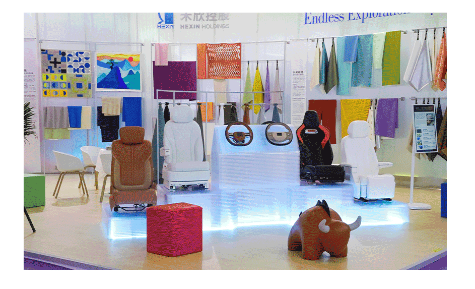 B面滿鋪的材料結合藝術化展陳手段,通過色彩流行趨勢、后整理產品、皮革畫等,全方位呈現“新材料美學”。舞臺的前景位置則圍繞著車用領域,集中展現禾欣在這個新賽道上的創新表現,通過汽車座椅、方向盤以及整車內飾場景的不同應用,體現了新材料從民用到車用、從經典到未來的無限可能,為展會帶來更多創意和靈感。